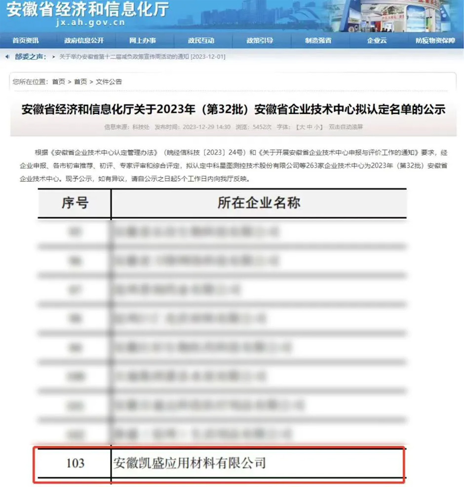 01. 凱盛應材獲得安徽省企業技術中心認定
