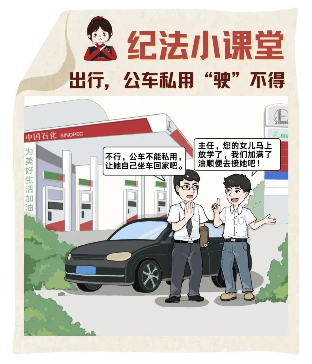 公車姓“公”不姓“私”,絕不能開著公家車辦私家事,要堅決摒棄貪小便宜、存僥幸心的心理,切莫在“車輪上”栽跟頭。