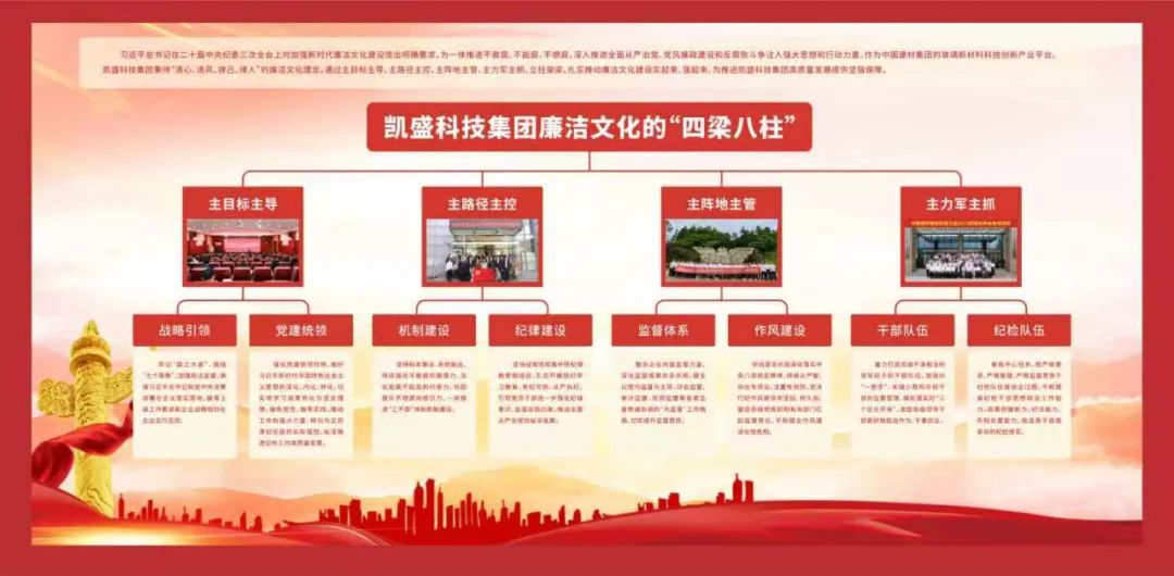 把加強廉潔文化建設作為黨建經營互促提升的重要抓手,以“主目標主導、主路徑主控、主陣地主管、主力軍主抓”為梁,以“戰略引領、黨建統領、機制建設、紀律建設、監督體系、作風建設、干部隊伍、紀檢隊伍”為柱,立柱架梁,打造凱盛集團廉潔文化的“四梁八柱”,推動廉潔文化建設實起來、強起來,教育引導黨員干部錘煉黨性、提高思想覺悟,為加快建設世界一流玻璃新材料科技產業集團提供堅強政治保證。