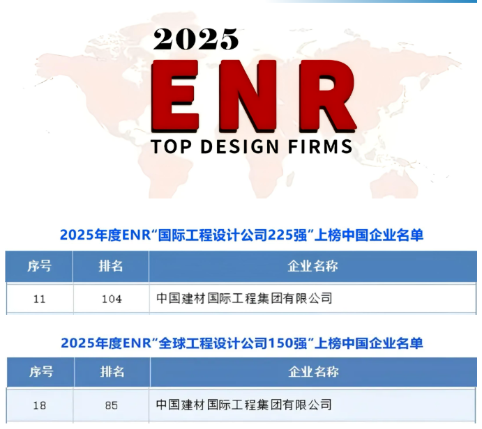 近日,2025年度美國《工程新聞記錄》(ENR)“國際工程設計公司225強”和“全球工程設計公司150強”雙榜發布。中國建材國際工程集團有限公司憑借雄厚的綜合實力和卓越的業績表現,連續第八年入選國際工程設計公司225強榜單,連續第三年入選全球工程設計公司150強。2