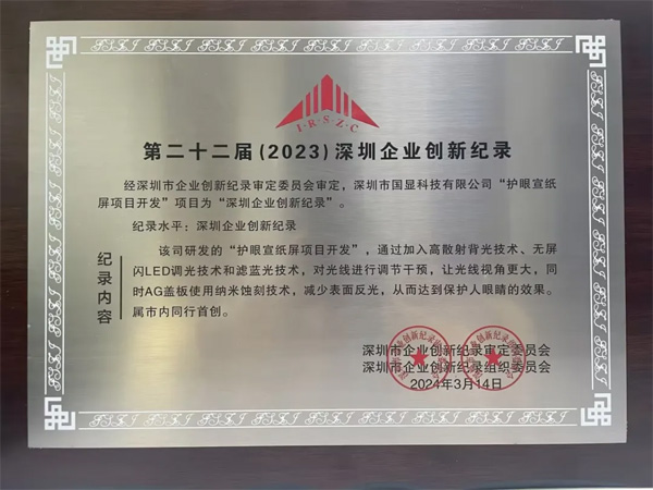 01. 深圳國(guó)顯“護(hù)眼宣紙屏項(xiàng)目開發(fā)”獲得“深圳企業(yè)創(chuàng)新記錄”